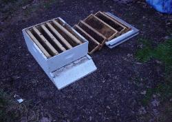 | The hive body has been removed here and the IPM bottom is shown. The IPM bottom helps control mites in the hive as they cannot reenter once they fall through |